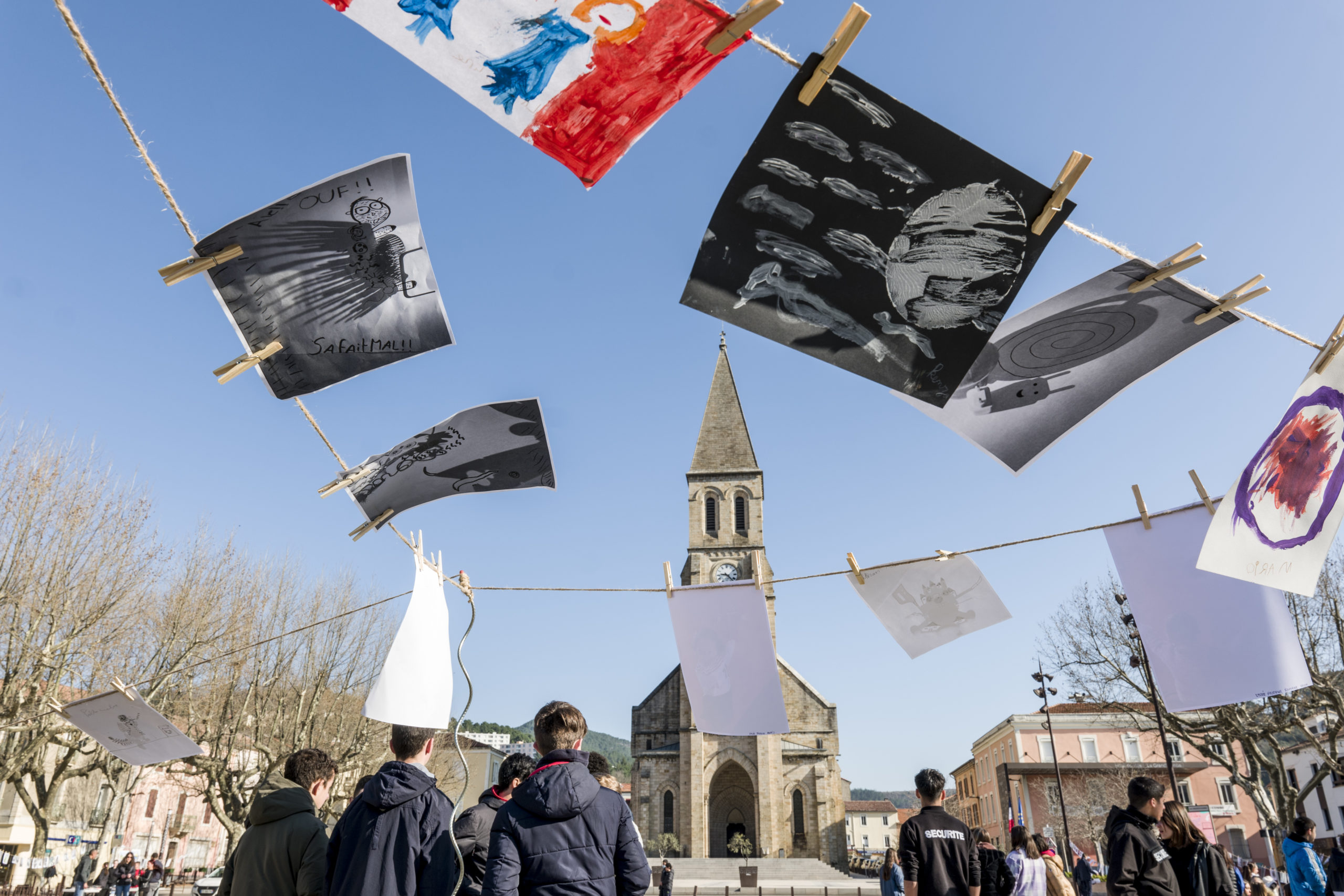 « Notre installation a rassemblé plus de 800 réalisations suspendues sur la place du marché… et un millier de personnes pour voir cet étendage ! Du centre social à la médiathèque, de la maternelle à l’EHPAD, de l’association BD Aux portes des Cévennes à l’EPIDE (soit 16 partenaires) tous ont œuvré ensemble avec enthousiasme et souhaitent recommencer l’aventure au printemps prochain ! »