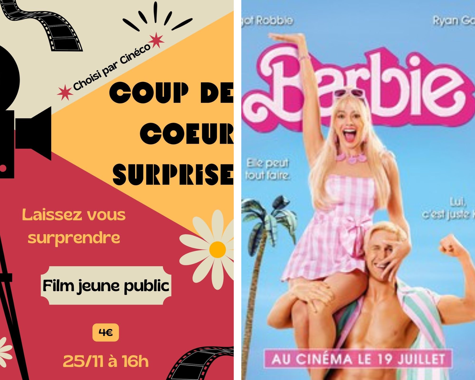 Soirée Ciné – Repas Musical16h – Coup de cœur surpriseUn film jeune public choisi par Cinéco à découvrir sur place… Laissez vous surprendre…! 19h – Barbie 1h55 – Comédie, Famille – Royaume-Uni, États-Unis d’Amérique (VO) Dès 13 ansDe : Greta Gerwig Avec : Margot Robbie, Ryan Gosling, America Ferrrera, Emma Mackey, Will Ferrell, Simu Liu SynopsisUne barbie jugée pas assez « parfaite » part à l’aventure dans le monde réel.Bande annonceUne petite restauration sera proposée sur place par La Berline : Assiette de tapas à 8€ Et petits gâteaux sucrésIMPROMPTU MUSICAL par Pauline Malbaux…+ Ajouter à mon Agenda Google+ Exportation iCal / Outlook Date25 11 2023Expiré! Heure 16h00 Tarif4€ la séance LieuEspace Culturel La Berline