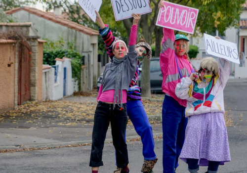 Après trois années de travail avec un collectif de neuf femmes qui a abouti à la création de Nous impliquer dans ce qui vient, est apparu le désir de proposer des formes courtes afin de continuer à activer l’abondante matière qui les a réunis. Partager leurs jeux, leurs outils, leurs imaginaires avec le public d’ici et ancrer ainsi leur présence sur le territoire. Avec cette idée de base de porter leurs revendications de manière festive et généreuse, elles nous proposent, après une résidence d’une semaine dans les communes, la création d’une forme atypique, en duo, trio ou quartet, en lien direct avec leurs pratiques, entre danse, théâtre, mime et clown et cela dans l’espace public.